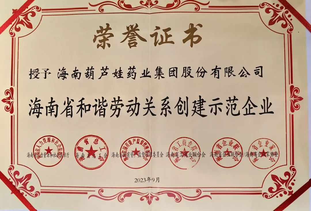 和记官网药业集团获评“海南省和谐劳动关系创建示范企业”